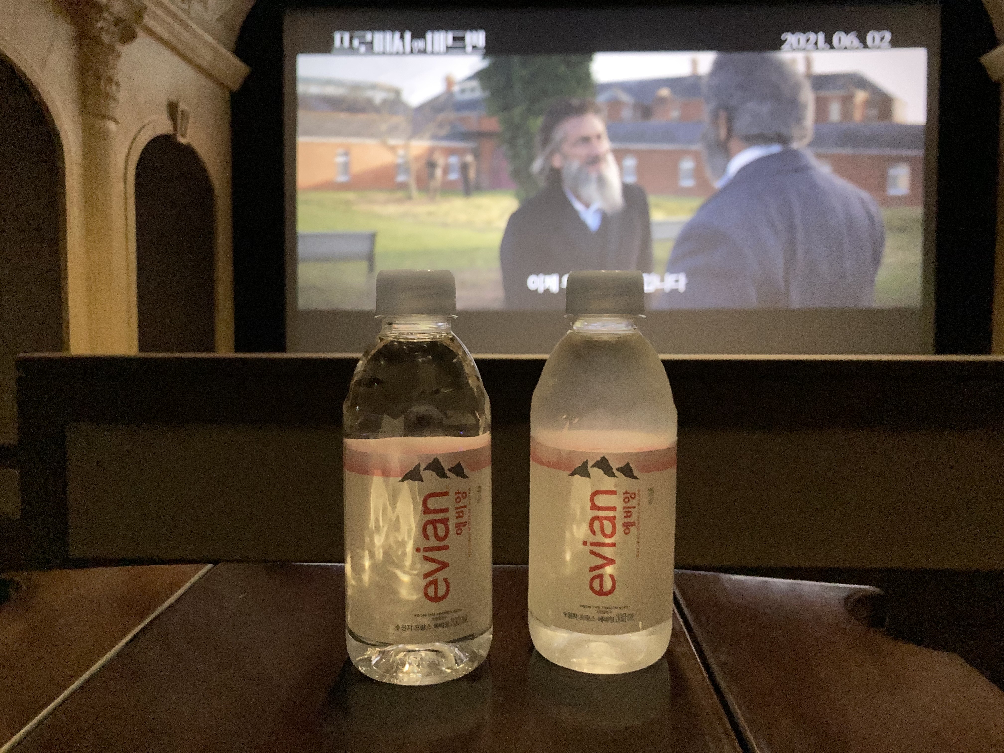 객석마다 에비앙 생수가 비치되어 있다