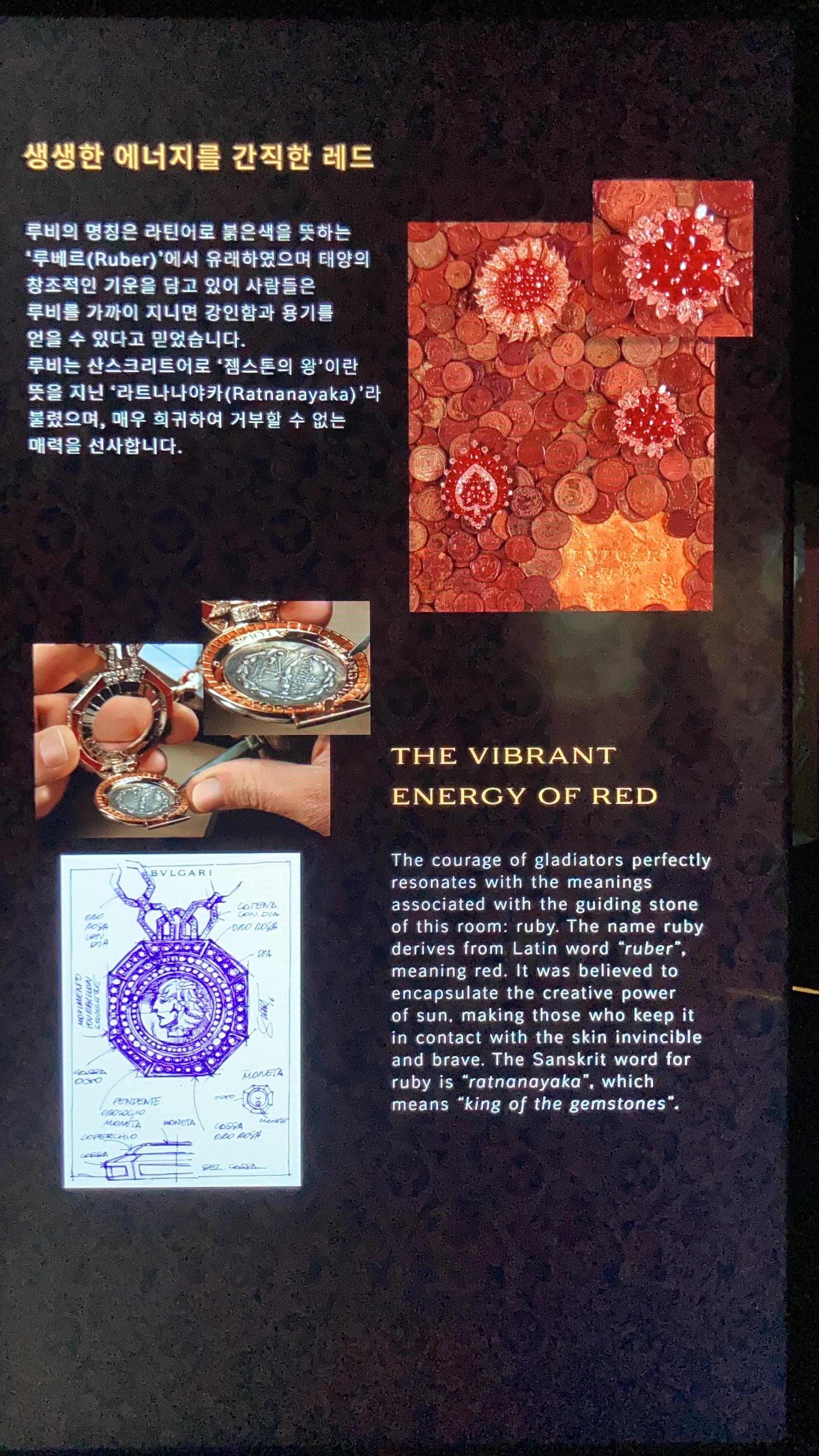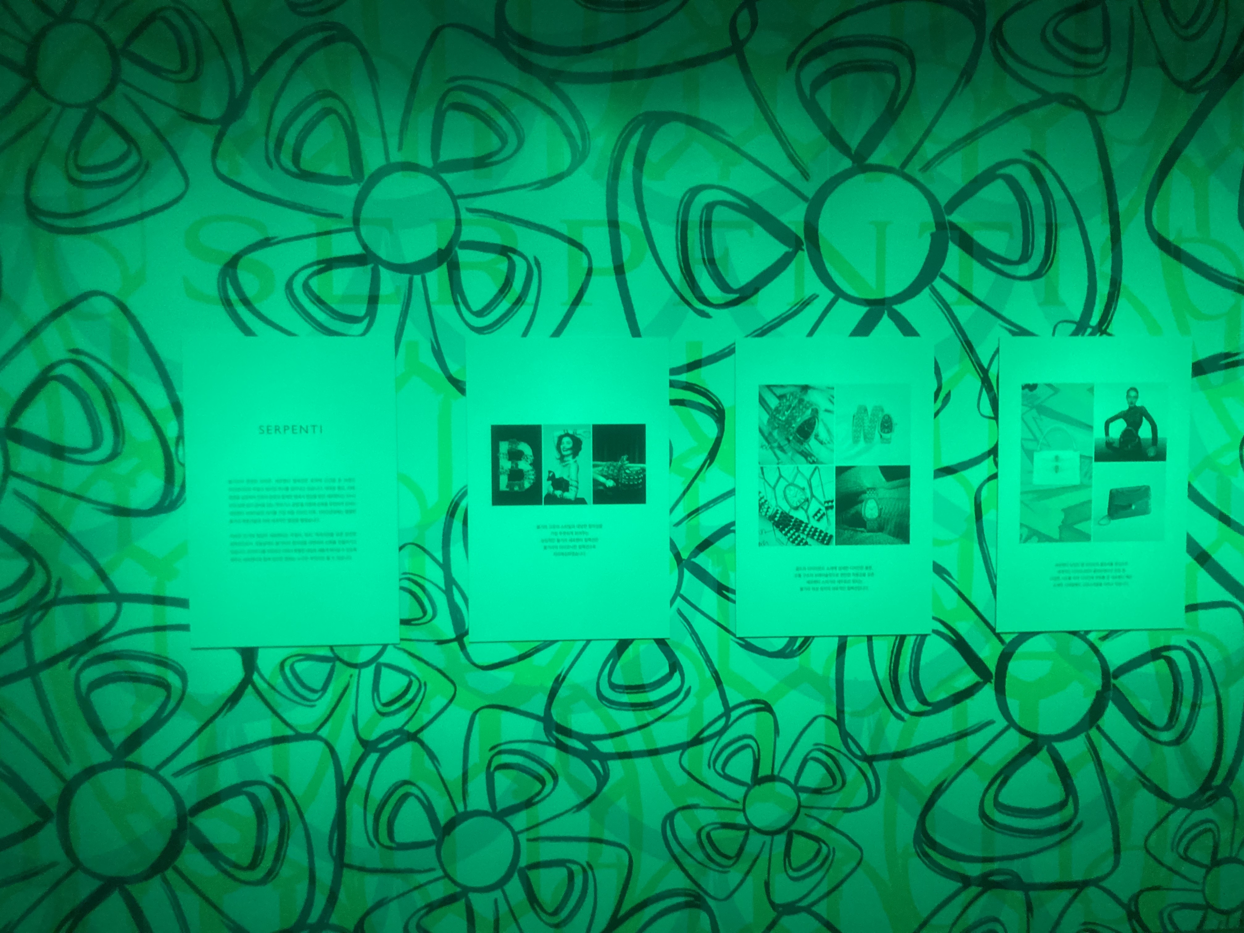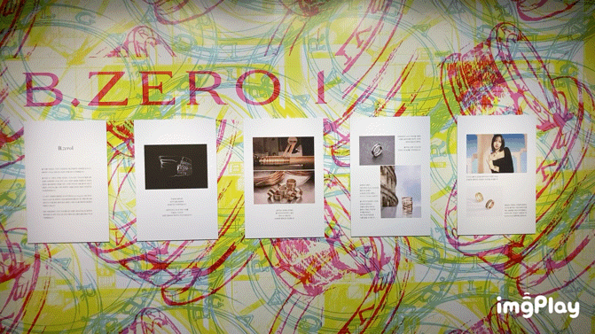 메인 전시회장 옆으로는 컬러 체험공간이 있습니다. 입장시 지급받는 셀로판지를 눈에 대면, 벽면에 다른 무늬가 나타납니다. 불가리의 아이덴티티를 잘 보여주는 체험이었습니다. 전시장 전체에 그려진 그림이 눈 앞에서 바뀌는데, 그 느낌이 색다릅니다.