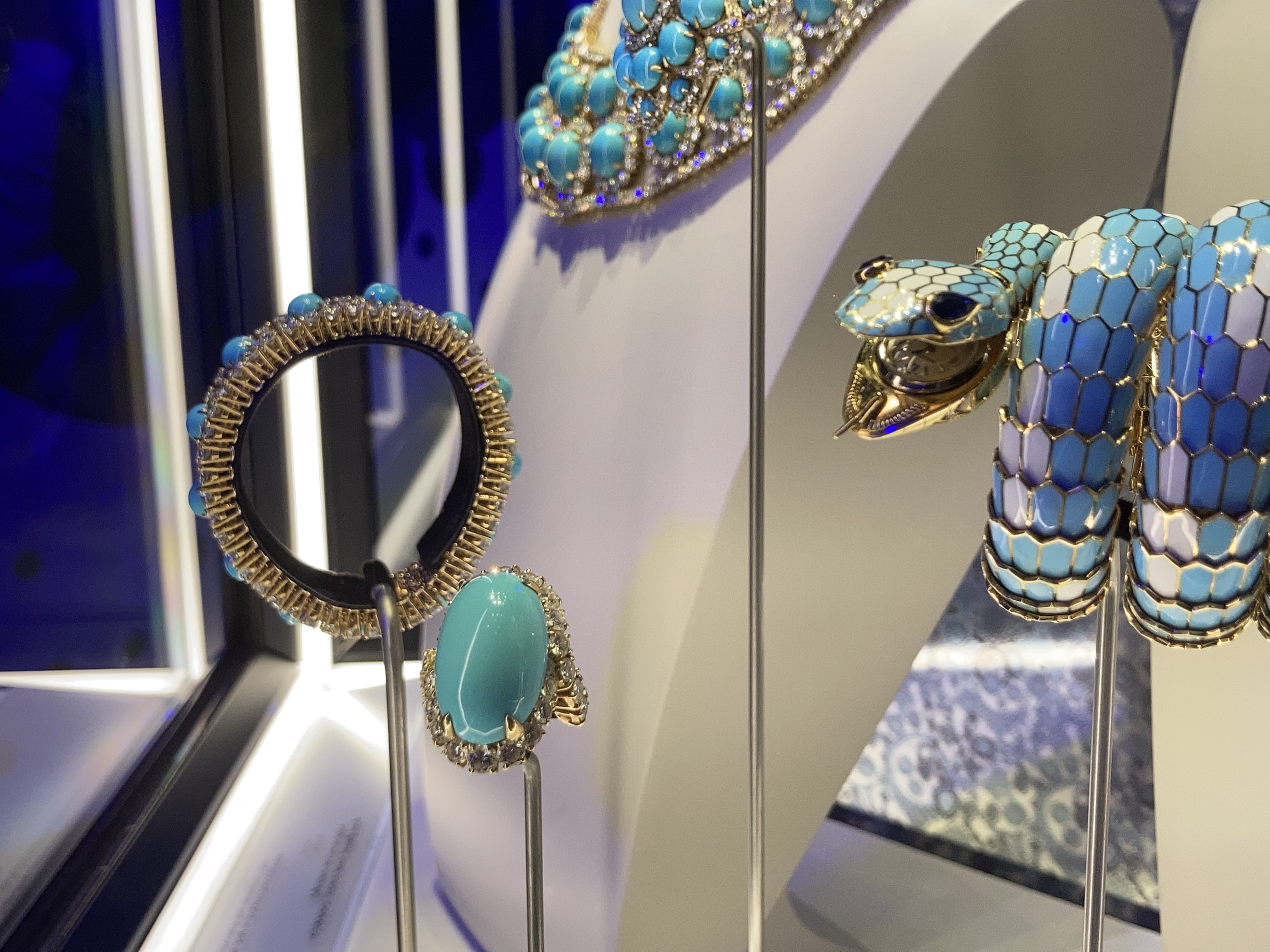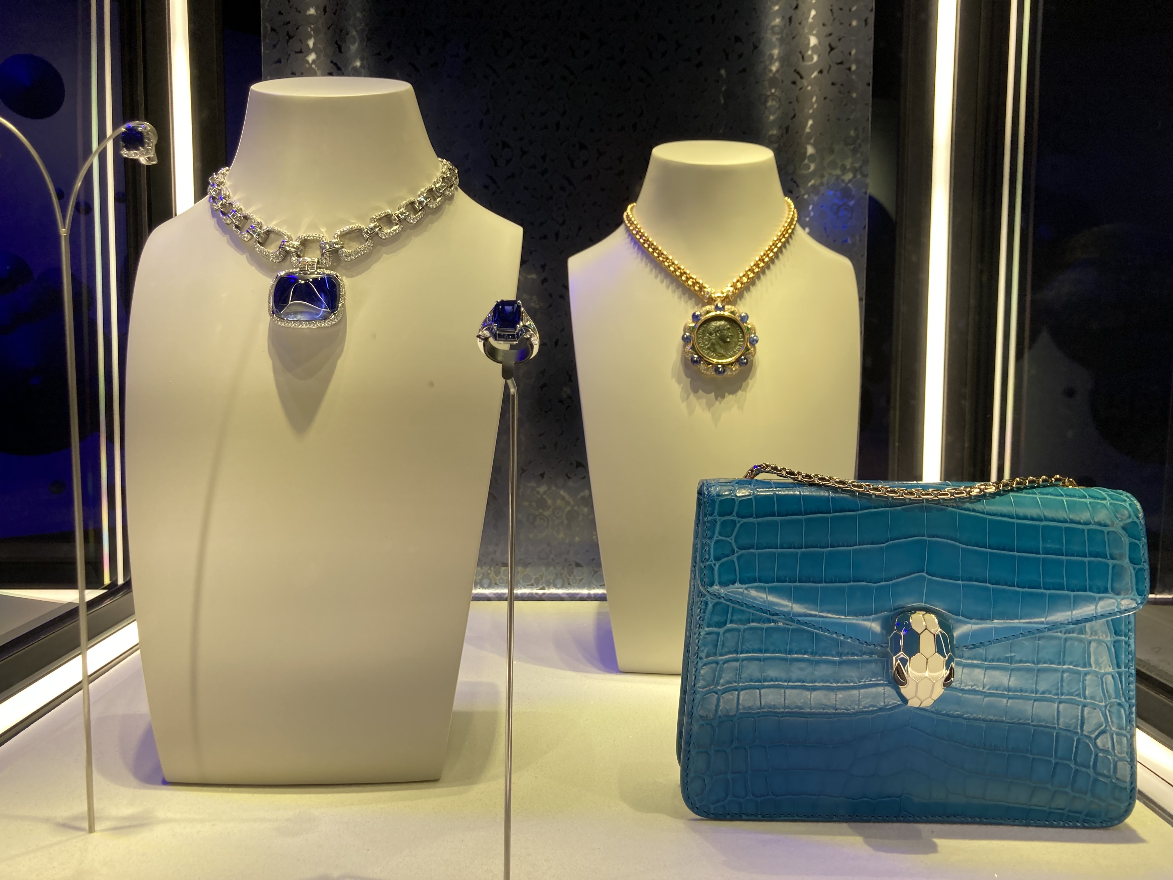 두번째는 '블루'입니다. 불가리는 블루에 천상의 고요함을 담아 냈습니다. 파란색은 하늘과 바다가 떠오릅니다. 인간의 크기와는 비교가 안될만큼 거대한 공간들이죠. 잠수를 해본 분은 아실겁니다. 물속에 들어가면 소리가 차단되면서 고요한 적막이 깔리는 것을요. 불가리의 '블루'를 보고있자니, 고요한 하늘과 심해의 한 조각을 떼어온 것 같습니다. 참고로, 불가리에서는 핸드백 라인도 소량 생산 중입니다. 우수한 가죽 품질과, 보석 디테일로 많은 사랑을 받고 있습니다. 역시나 버클부분에 불가리의 상징, 뱀이 들어갔습니다. 사실상 보석하나를 가방에 달아둔 것과 마찬가지 입니다.