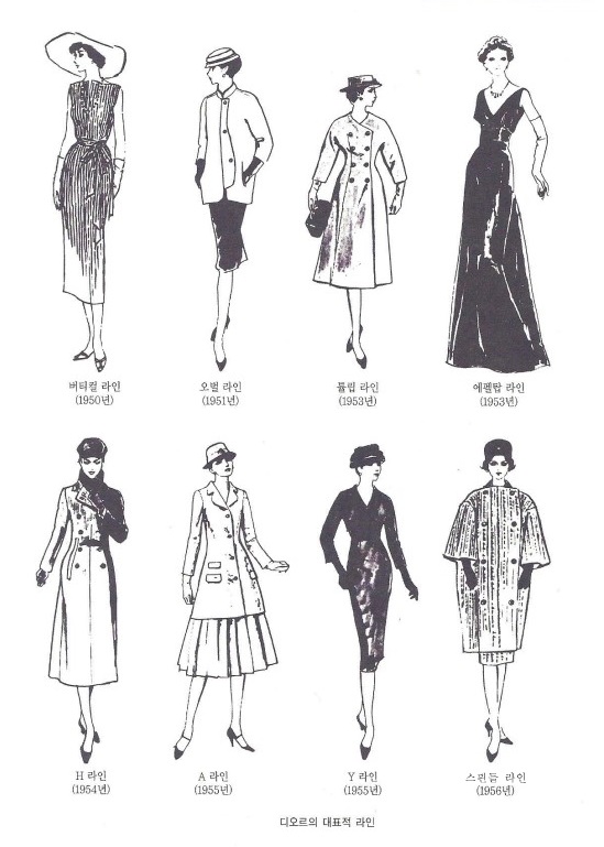 디올은 여성미를 강조합니다. 남성에겐 없는, 관능적인 곡선미를 정립합니다. 그렇게 탄생한 것이 'H 라인, A 라인, Y라인, 튤립라인' 과 같은 디올 라인 입니다. 현재까지도 여성복의 기본 베이스가 되고 있는 라인들이죠. 라인마다 강조하는 디테일의 포인트는 다르지만, 한가지 공통점은 있습니다. 강조되는 허리라인과 부드러운 곡선입니다.