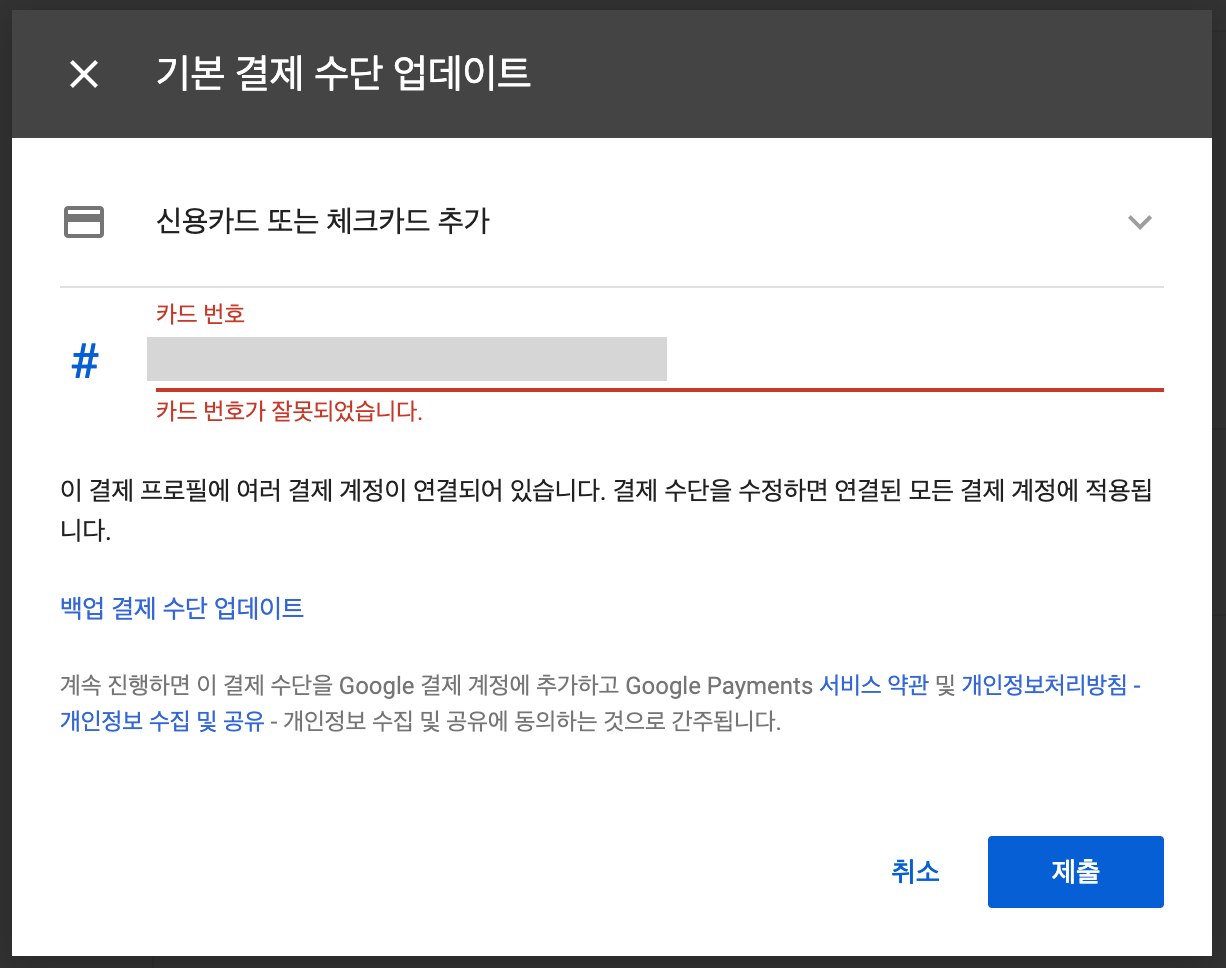카드번호 오류 메세지가 뜬다