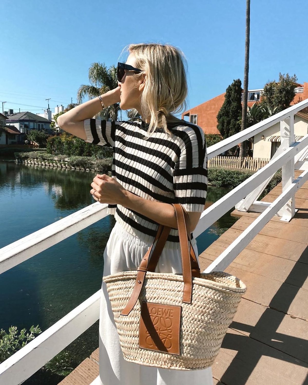 S/S 시즌 필수템으로 자리잡은 로에베의 라탄백. 식물성 소재에 로에베의 가죽이 더해져 캐주얼하지만 고급스럽습니다. 바스켓백 중에서도 가장 인기라인은 '라피아 바스켓백'입니다. 정석적인 토트백 모양으로 넓은 수납공간을 자랑합니다. 버드나무 가지를 소재로 촘촘하게 짜인 디테일이 고급스러움을 더합니다. 저렴한 소재인 라탄과 최고급 로에베 가죽이 조화롭게 믹스매치를 이룹니다. 끈길이 조절이 가능하고, 라탄소재라 가벼워 실용적입니다.