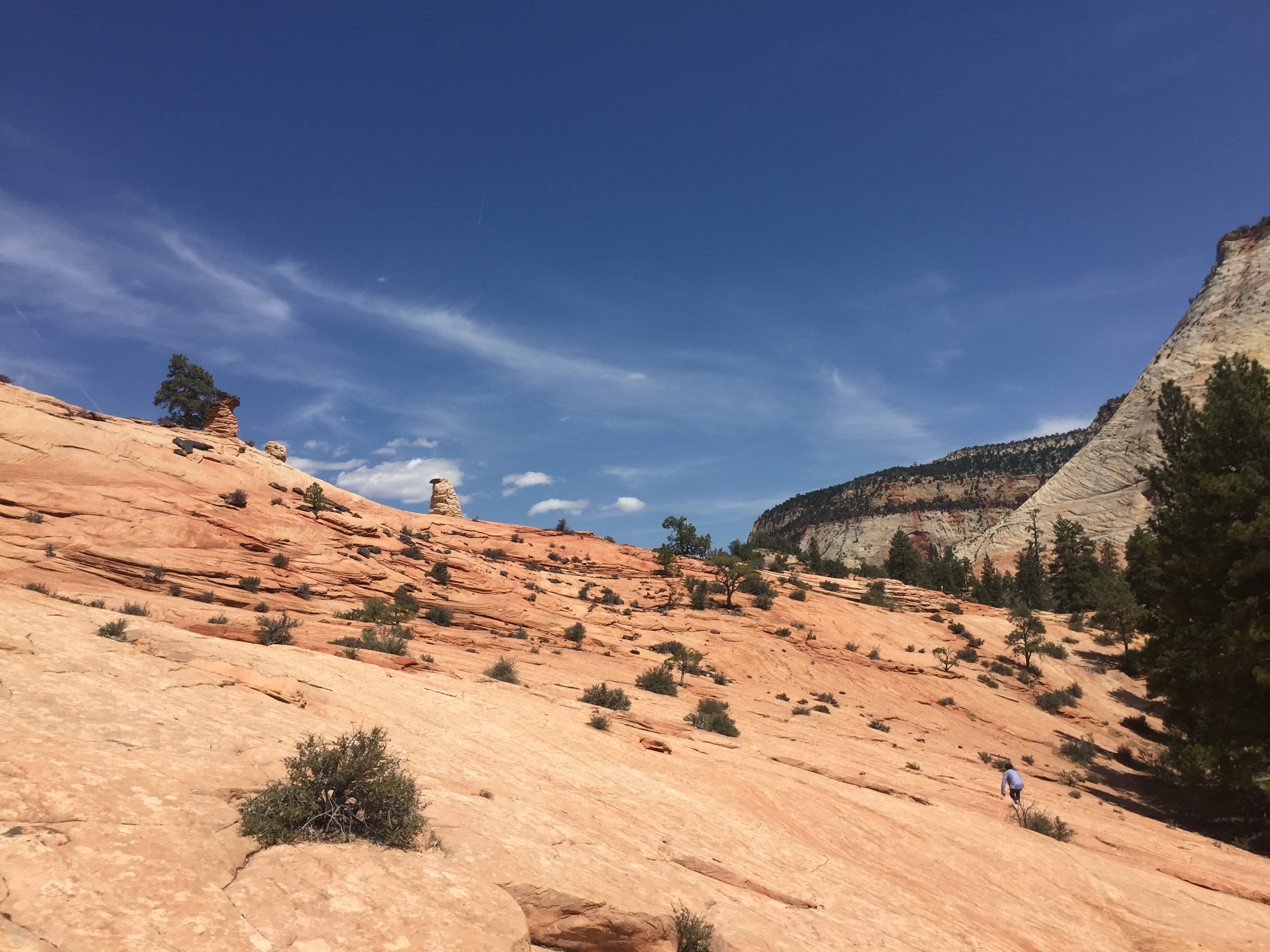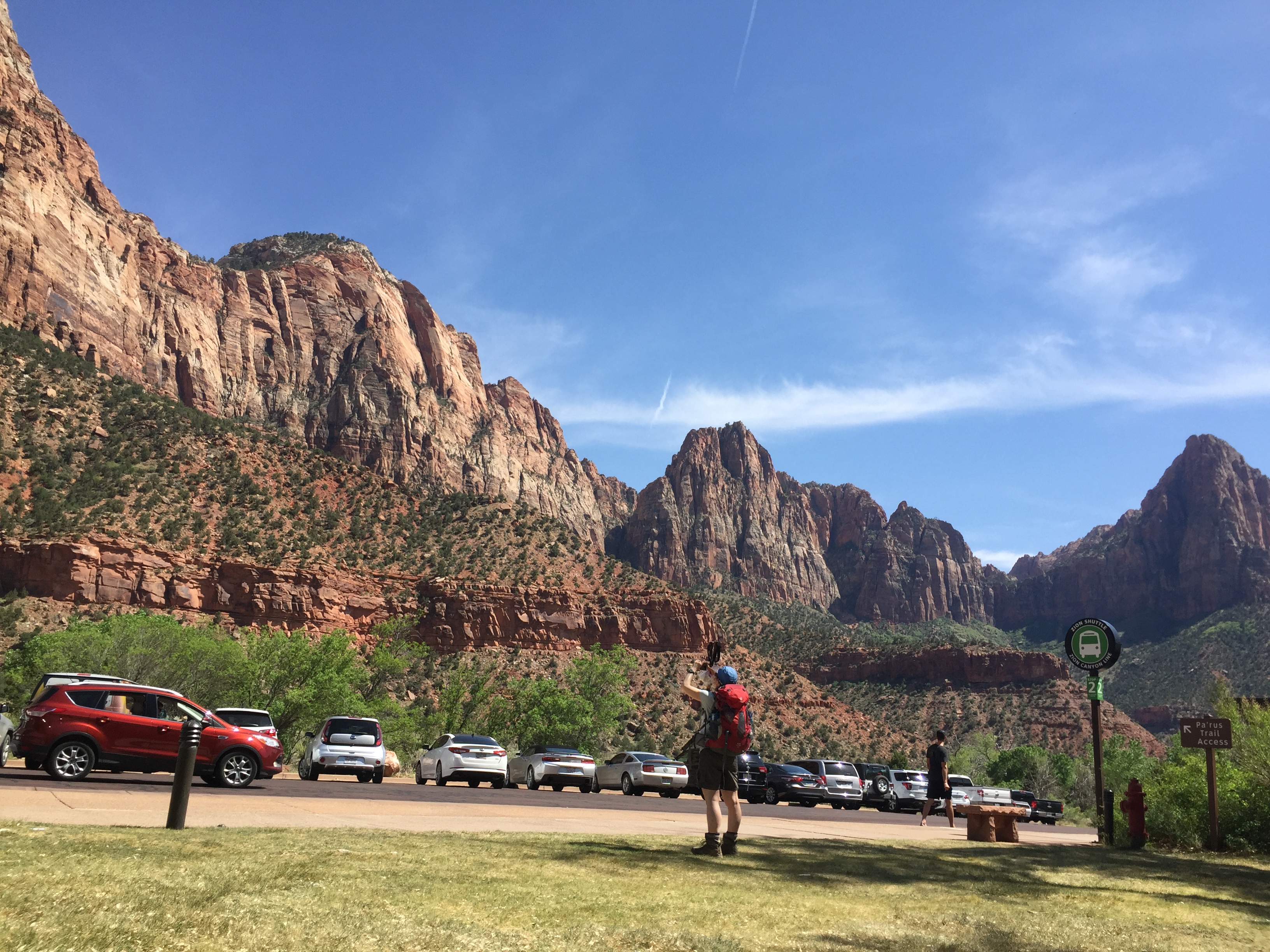자이언 캐니언 관광 안내소 앞. 거대한 바위산이 병풍처럼 늘어져 있다. 실제로 보면 거대한 크기에 압도당한다. 압도당하는 기분으로는 그랜드 캐니언과 브라이어스 캐니언을 뛰어 넘는다.