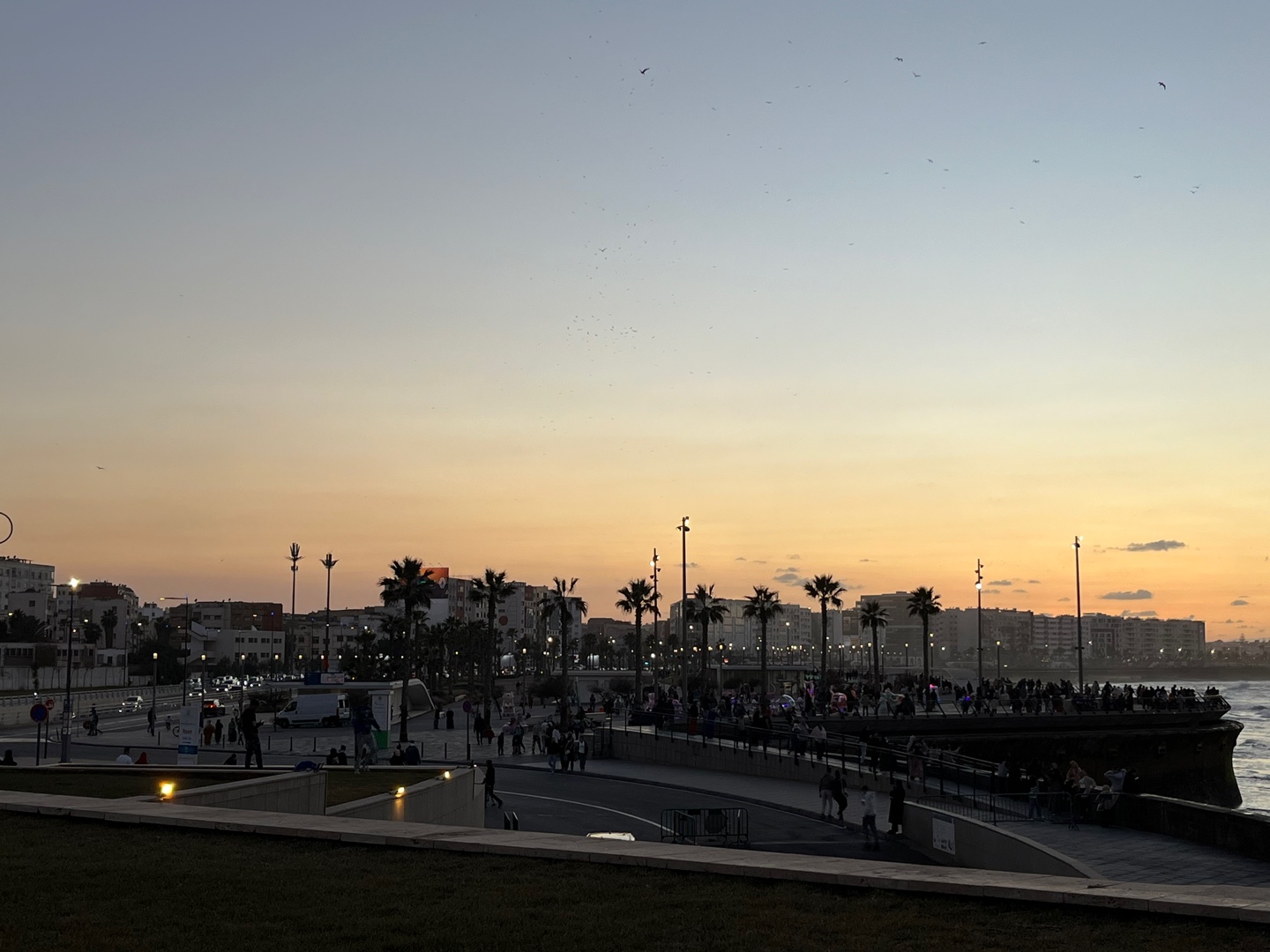 조금씩 더 어두워져가고 있는 카사블랑카의 해안가. 노을을 구경하려고 해안가 난간에 많은 사람들이 모여 있다.