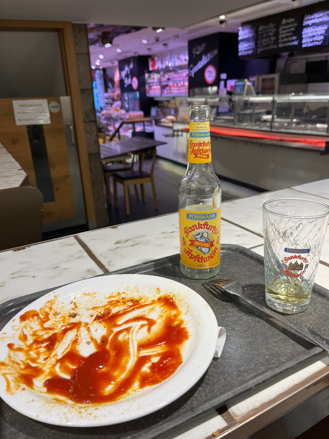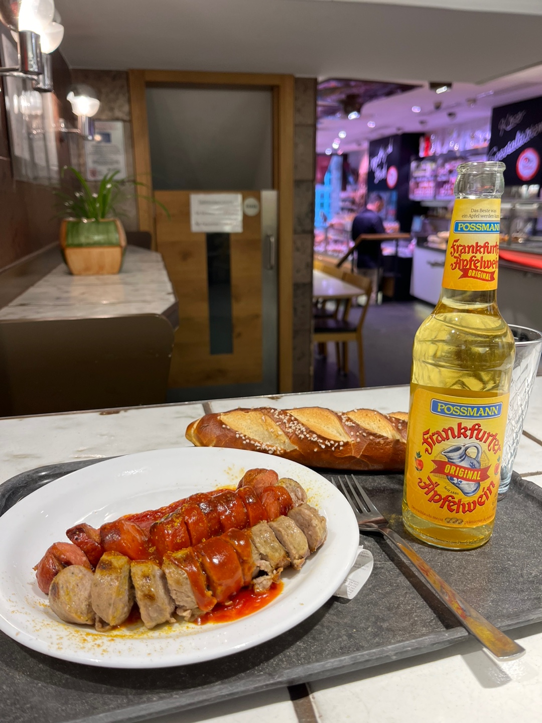 프랑크푸르트 음식으로 유명한 사과주 아펠바인 (Apfelwein)과 소시지 (Frankfurter Würstchen)를 꼭 맛봐야한다. 대단히 맛있지는 않지만, 그래도 안 먹으면 서운하다. 소세지는 솔직히 짜다. 한국 소시지가 더 맛있는 것 같다. 근데 아펠바인은 먹어볼만하다. 아펠바인의 종류도 정말 많고 기프트숍이나 슈퍼마켓에서도 판매한다.