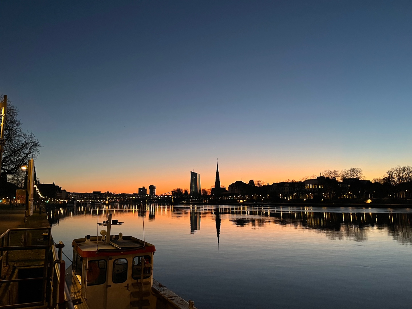 동이 트고 있는 프랑크푸르트 마인강. 뷰가 정말 예술이다. 저 앞쪽에 보이는 다리가 유명한 달이라고 한다.