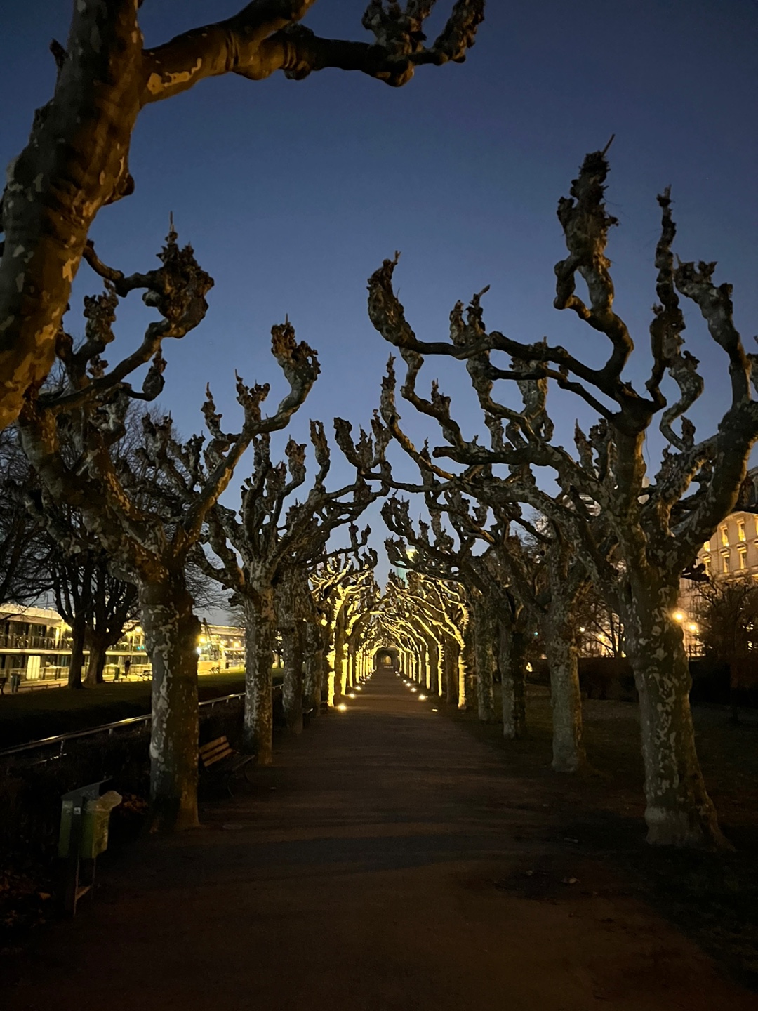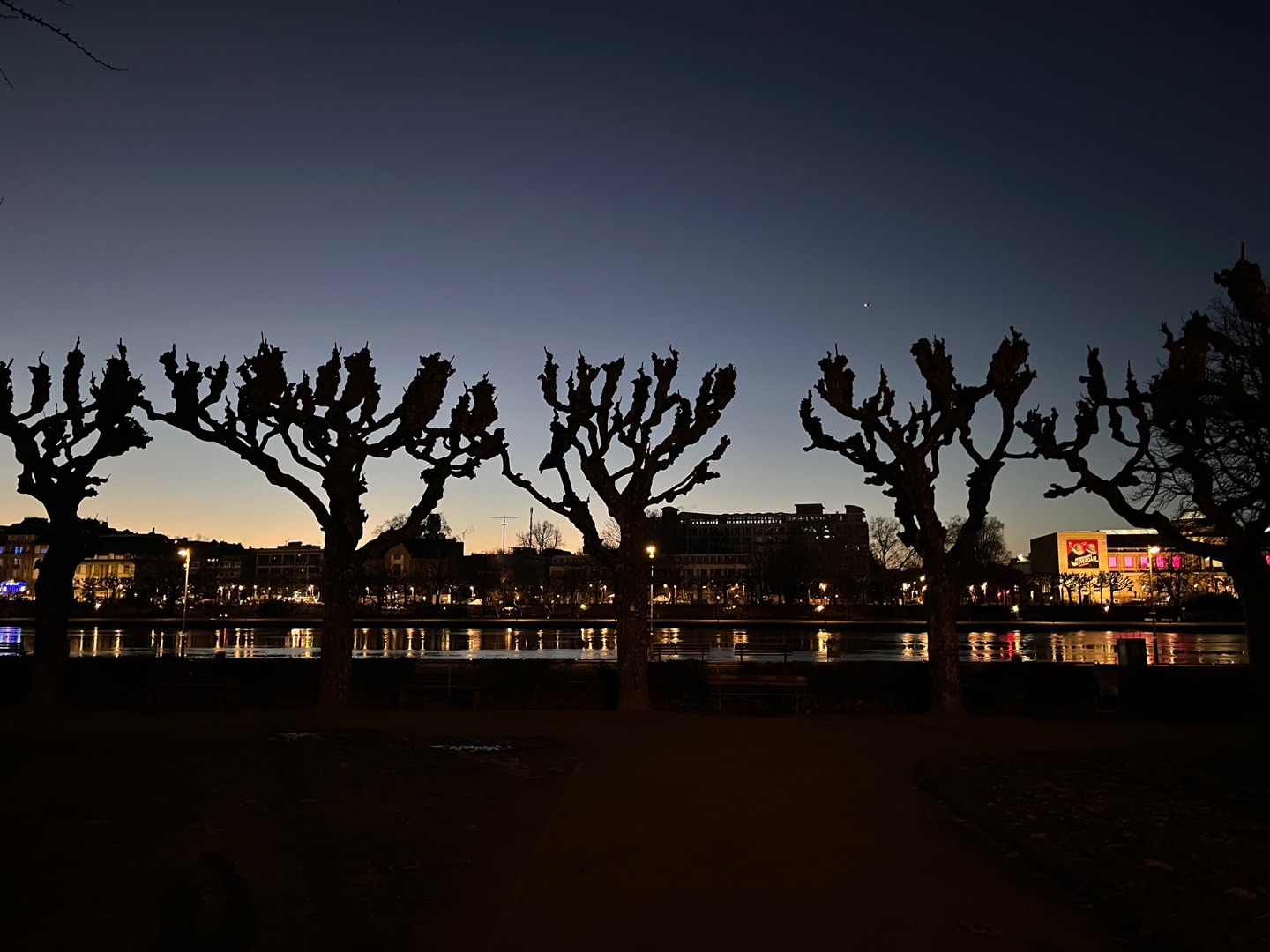 마인강까지 오니 러닝을 하고 있는 사람을 종종 만날 수 있었다. 모양이 정말 특이한 나무가 주욱 가로수로 있었는데, 겨울이라 잎사귀도 하나도 없어서 그런지, 꼭 마법에 걸린 나무 같았다. 뭔가 좀 으스스한 하달까. 더욱이 까마귀가 엄청나게 많다. 세상에서 까마귀가 그렇게 많이 모여있는 거는 프랑크푸르트에서 처음 보았다. 까마귀 우는 소리까지 더해져서 정말 무슨 마녀의 거리 같은 느낌이다.