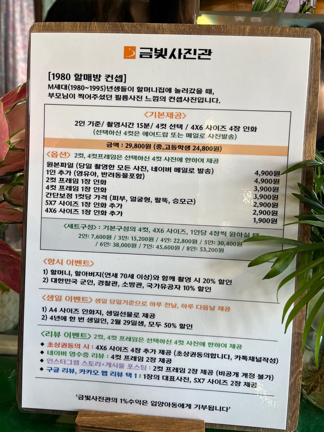 금빛사진관은 이름처럼 따뜻한 금빛 추억을 담아낸 공간이에요. 촬영 스튜디오는 아늑하고 정겨운 할머니방 분위기로 꾸며져 있어서 마치 할머니집에 간 것 같아요 📸 특히 추억의 소품들이 많아서, 사진 찍는내내 웃으면서 찍게 됩니다! 😄