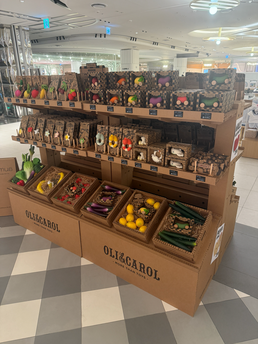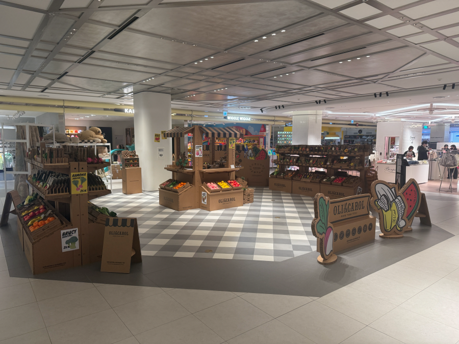 팝업스토어는 따뜻하고 자연 친화적인 분위기로 꾸며져 있어요. 종이박스 인테리어로 친환경적이고, 과일가게에 온 것 같은 느낌이에요! 아이들이 좋아할 만한 귀여운 디스플레이도 가득했답니다. 🐻